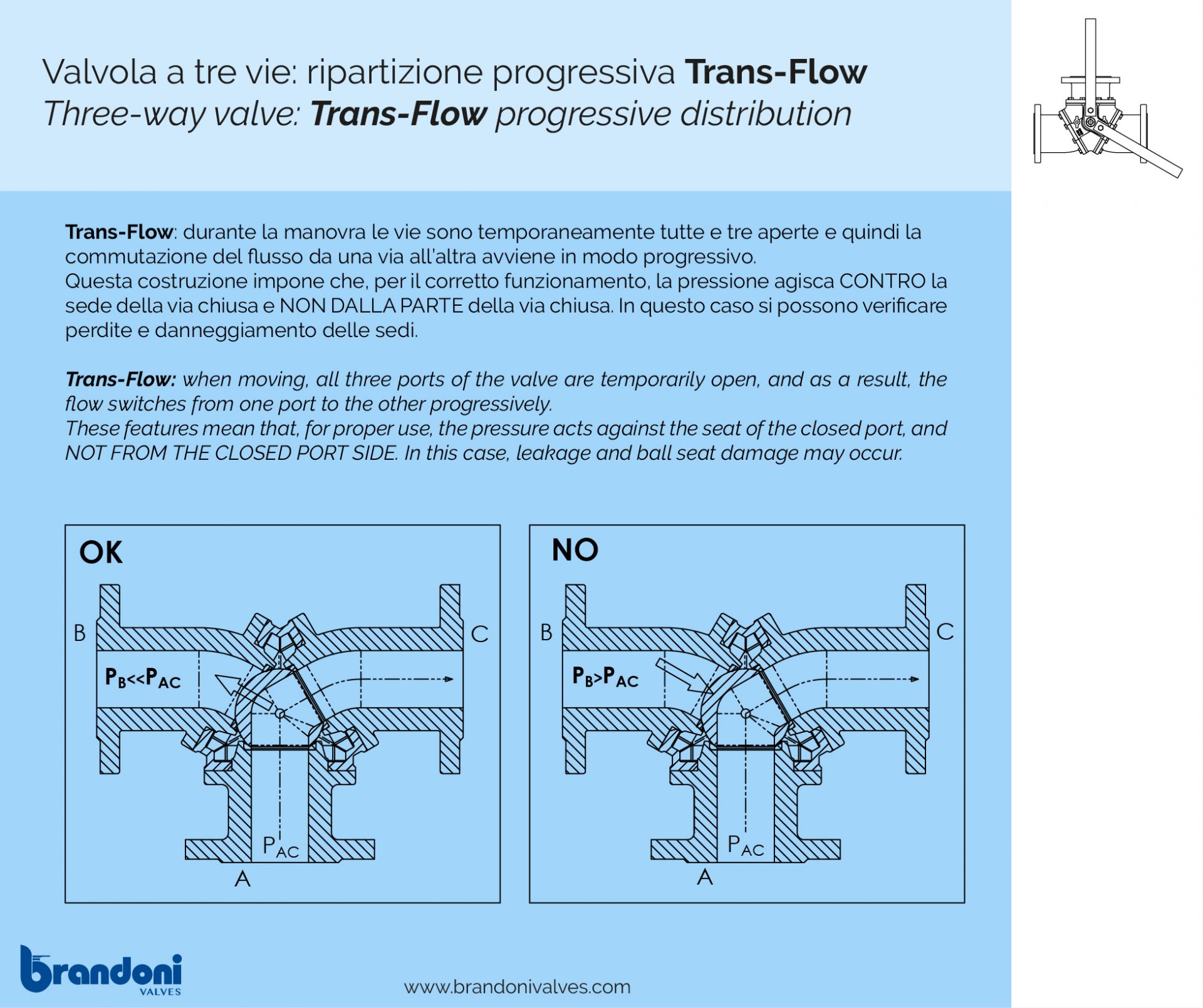 Trans-Flow: cioè durante la manovra le vie sono temporaneamente tutte e tre aperte e quindi la commutazione del flusso da una via all’altra avviene in modo progressivo.