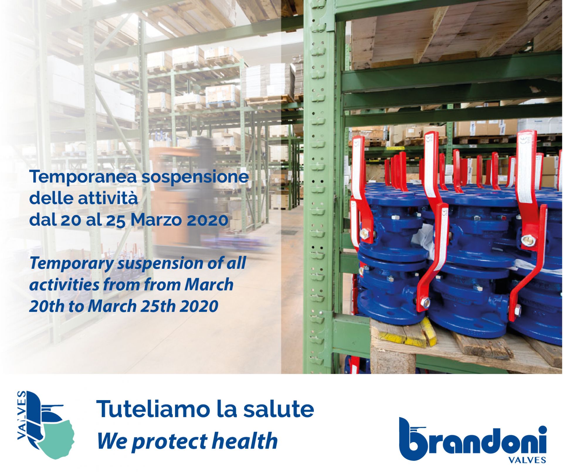 La presente è per comunicare che, in ossequio alle disposizioni miranti al contenimento della diffusione del virus COVID-19, Brandoni S.p.A., a tutela della salute e della sicurezza del proprio personale, ha deciso la temporanea sospensione di ogni attività a decorrere dal 19/03/2020 per i reparti produttivi e dal 20/03/2020 per i reparti logistici e gli uffici.