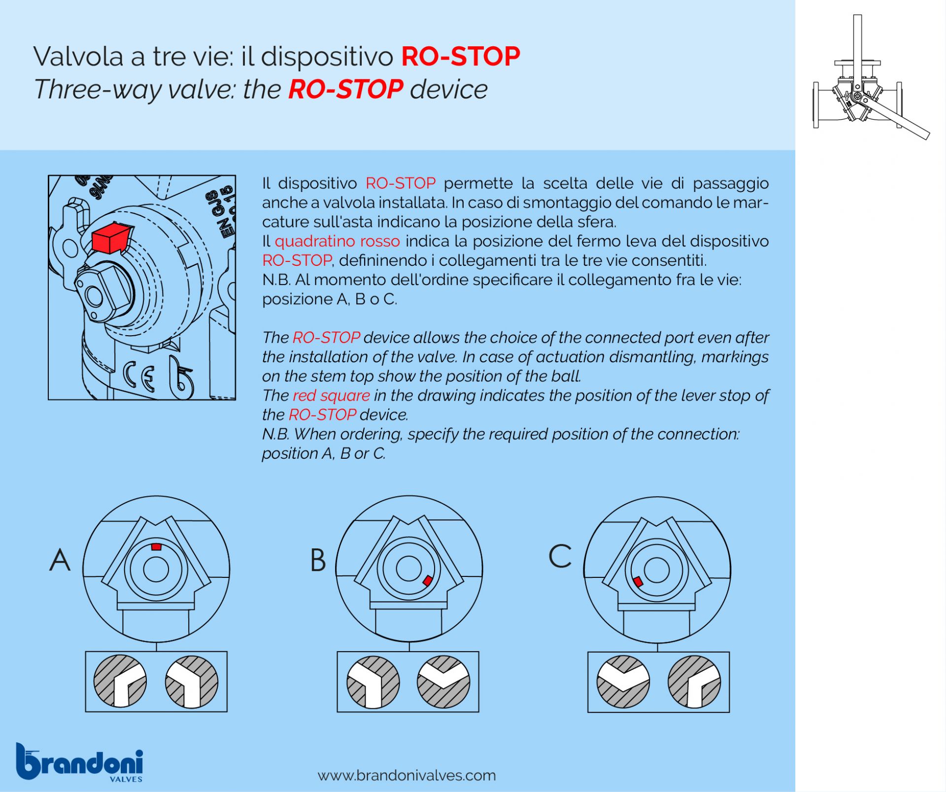 Il dispositivo RO-STOP è di particolare interesse perchè consente la massima praticità, in quanto permette la scelta delle vie di passaggio anche a valvola installata.