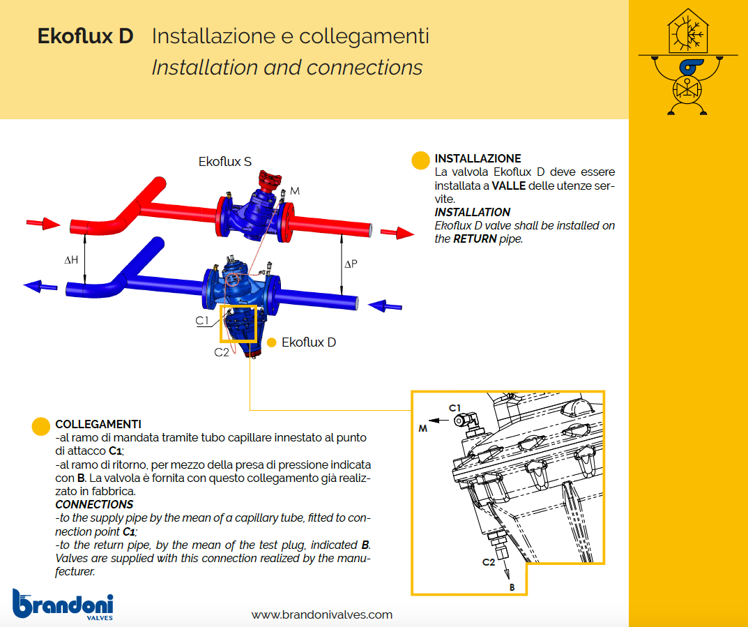 La valvola Ekoflux D deve essere installata a VALLE delle utenze servite, e deve essere collegata: